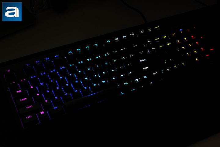 On the other hand, the lighting is where all the party pieces come out. As the keyboard is the Spectrum version of the Tesoro Excalibur, this means it comes with RGB lights. Tesoro says the full spectrum, or 16.8M colors will shine through, while the human eye may not necessarily distinguish between the color codes very close to each other. However, with the Excalibur Spectrum, there are several lighting options you can choose from. For one, there are four levels of brightness in addition to turning it off completely. In terms of different effects, there are a total of eight different lighting modes. Some are pretty standard, such as "Standard", which light up all the keys at constant brightness, as well as breathing mode and rainbow wave, which waves all of the colors across the board. There are also different modes that activate based on the key you press. Trigger mode activates the key itself. Ripple mode triggers a light that spans out to the entire keyboard, originating from the pressed key. Radiation is similar to ripple, except it only ripples out only on the row of the original pressed key. Firework mode activates the key and the eight other keys around it, and slowly fades like a firework. Finally, there is one mode which Tesoro has named "Spectrum Colors", where you can select each key and make it each its own color. From here, you can also make them either stay constantly on, breathe, or activate based on triggering the key. All in all, the modes are quite interesting to impress little boys, but they are very distracting in daily use. I am not complaining, as I am quite happy with these modes, but I wish they also included the "Audio" mode, which is found in the Tesoro Lobera Spectrum. As for the lights, they are very bright and shine quite evenly through. I do notice the lights tend to emit a cooler color temperature. What you see in the configuration software may not be the exact color you get with the lighting, but this is probably true with any RGB keyboard.