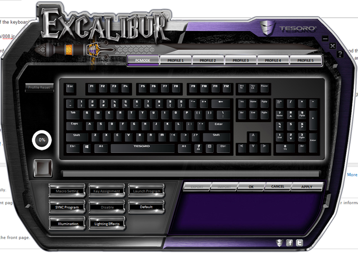 Speaking of the software, Tesoro's utility can be found and downloaded from their website. The top bar shows all the different profiles, which is five plus the PC mode. I should note users can only create macros in the profile mode, but unfortunately the profile modes automatically disable the Windows key without any way to re-enable it. Going through the eight buttons below the keyboard layout, there is the macro setting, key assignment, launch program, sync program, disable, default, illumination, and lighting effects. Macro setting is pretty obvious, and allows users to create macros to be activated by any key of their choice. As there are no additional macro keys, users will have to replace current keys with new functionality. Key assignment let users reassign single keys to do different things. Launch program is similar to key assignment, except it allows users to... launch programs. SYNC Program is a strange tab, which presumably allows users to resynchronize programs. Disable allows users to disable keys, and default returns the key to the factory settings. Illumination allows users to change the base color used for backlighting. Finally, lighting effects allow users to change to different lighting effects as mentioned in the prior paragraph. On the right side are five extra buttons, which allows you to export and import your settings, save and exit the program, exit without saving, and apply settings without closing the application.