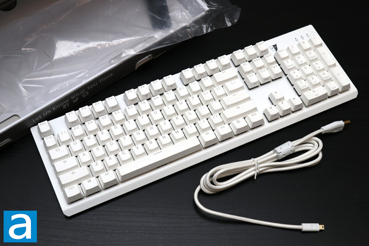 Out of the box, we have a pretty typical set of items in here. The Tesoro Gram MX One is found in a clear plastic bag to prevent any surface damage to the keyboard itself. In a separate plastic wrap, we also have the braided 1.8m white cable, which is a mini USB to USB one. Otherwise, we have a small manual that shows off the secondary functions and some features. It also contains warranty information, which is a one year length from Tesoro. It is a bit short in my opinion, as I think two years is the standard now. No other accessories like carrying bags, keycap pullers, or additional keycaps are included, though some of these are not as necessary, as you will see later on.