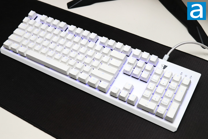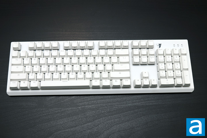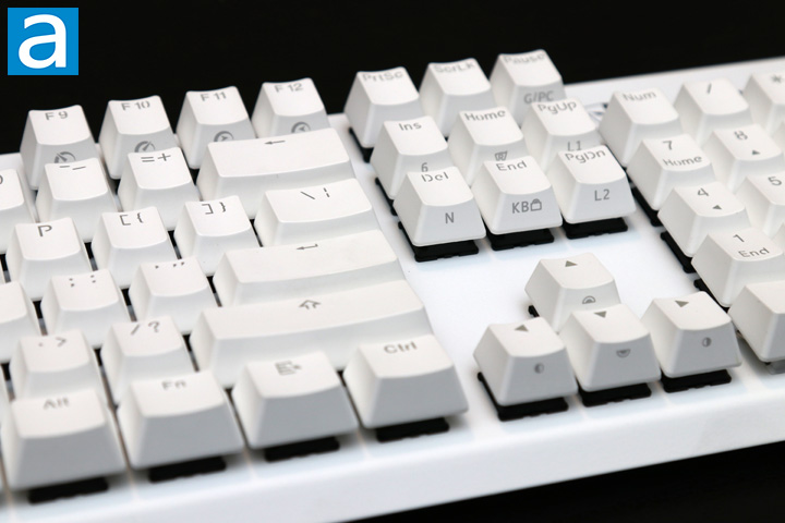 The Tesoro Gram MX ONE arrived in a standard 104-key QWERTY ANSI layout. The overall layout looks exactly like the aforementioned Gram SE Spectrum. This means we have the standard bottom row with the Windows, Fn, Menu key, Ctrl, and Alt keys all being the same size. As for the indicator LEDs, these can be found in their standard top right side above the number pad. These three indicator LEDs are used for gaming mode, Num lock, and Caps lock, and are indicated as expected. As for the keycaps on top, these are quite a bit thicker because these are made with PBT, or polybutylene terephthalate. Unlike the standard ABS plastic, this material is stiffer, harder, and keeps its color better. This means you should not see things like fingerprint staining, which is especially important with a white exterior. The keycaps are made with a double injection process, as you can see the two different plastics. This process is where plastic is molded around an insert. While it is probably the most costly process in creating a keycap, it also creates a well contrasted font since there will never be any fading on the letters. I do not love the choice of font for these keys, as some letters may be harder to read than others, but this is a preference thing.