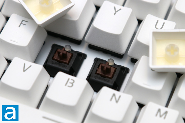 Our unit of the Tesoro Gram MX ONE features Cherry MX Brown switches. This switch is known as a hybrid switch, combining the quieter design of the Reds with the nonlinear travel and tactile feedback found in the Blues. These are rated to last up to fifty million keystrokes, which is as expected. Cherry MX Browns still require a 45g force for actuation with a travel distance of 4mm and actuation distance of 2mm. Otherwise, you can see the single LED for each switch located at the top of the switch. This is a single color LED, as you will see later on in our review.