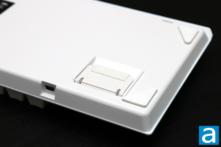 From this angle of the back and bottom, you can see two important things. First, the connection here is a mini USB connection. This is an older standard for mechanical keyboards, though I would have liked to see the newer USB Type-C connection. The cable accompanying the Tesoro Gram MX ONE matches the rest of the enclosure in color and measures in at 1.8m in length. There are no additional USB ports or audio connections in this area, though I have never really found them useful before as they often require other connections into your computer. At the bottom, we have nothing too surprising. With a triangle in all corners, these rubber feet keep the Gram MX ONE in place. Two back feet kick out to raise the keyboard up. These feet are capped off with rubber to prevent them from sliding about on harder surfaces. There is a large sticker in the center with model information and the serial number.