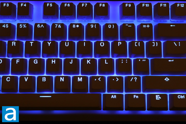 It has been a while since I have seen a keyboard with only a single color of backlighting, but this is what we have on the Tesoro Gram MX ONE. Tesoro also does not include any software for changing lights or macros, though the process to do so is pretty straightforward. Starting with the secondary keys, you can change the lighting brightness and effects using the Up/Down and Left/Right arrows, respectively. There are a total of three lighting levels as well as allowing users to turn them off completely. The effects switch between effects of solid, breathing, wave, spiral, reactive spread, reactive single, reactive row, raining, reactive reverse spread, reactive punch, and two custom recording modes. Some of these can be altered in terms of effect speed or direction, which can be changed using the secondary functions of F9/F10 and F11/F12. Finally, the two custom lighting are recorded using the Page Up and Page Down secondary functions. Page Up is used for static recording, which means you can change which ones are turned on or off. Page Down is used for recording dynamic modes, which also record the sequence in which the lights turn on in a reactive manner. This secondary dynamic recording is an interesting way to record lighting, offering what I think is a good amount of customization considering there is no software or other colors included.