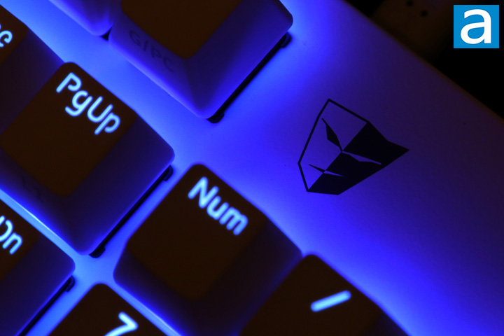 As for the lighting quality, you can see the blue lights shine though the top. As the light is located on the top of the switch and none of them are clear for light bleeding, the overall situation is not the most vibrant compared to other keyboards. In addition, any of the font that is on the second row of the keycap, such as on the number pad, do not show as much, even under maximum brightness. Considering the market and target for the Tesoro Gram MX ONE, it is not too surprising to see only a single color used here, but I also appreciate RGB on keyboards. We still have the slight blue under glow of the keycaps with this floating design, but once again, it is not as impressive as some other keyboards due to the opaque switch housing.