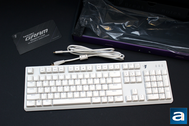 Out of the box, there are not too many extras with the Tesoro Gram Spectrum. In fact, the only surprise I found while opening it was the fact the keyboard was white in color. Only after opening it did I realize the color choice was already indicated on the box. For reference, the Gram Spectrum comes in black and white, but it is refreshing to see a different color than gray or black on a keyboard. The keyboard itself is wrapped in a clear plastic bag to protect the keyboard from any scratches or dings. There is also a white braided mini USB to USB cable, measured at 1.8m long. Finally, there is a small user manual with warranty information. Warranty with Tesoro is limited to a single year, which is a bit short in my opinion.