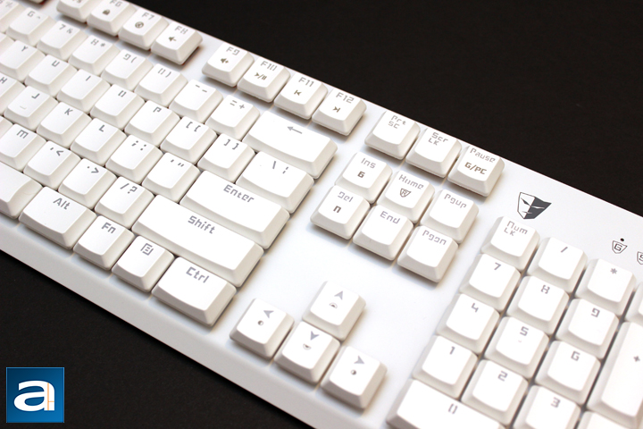 As you can see here, the keycaps on the Tesoro Gram Spectrum themselves are all white in color, but unlike usual keycaps, they have a much thinner profile. They are actually remind me quite a bit of older laptop keyboards. Most keycaps on mechanical keyboards are around 11.5mm high, while these keycaps are slimmer at 6.2mm of thickness. The keycaps are also said to be made with a double injection process. This process is where plastic is molded around an insert. While it is costly, the advantages include a very well contrasted font, with no fading ever to happen on these keys.