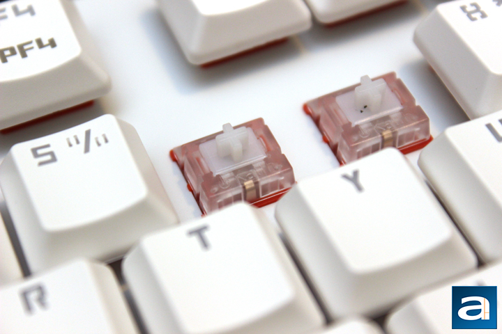 Before continuing on, one of the main selling points of the Tesoro Gram Spectrum is its mechanical key switches. There are three main types of keyboards in the market today. The cheapest but most common is the membrane keyboard, which is the easiest to make, but also has poor typing feel and response due to squishy keys. Next is a scissor switch keyboard. This can be thought of as an enhanced rubber dome, with two extra interlocking plastic pieces connected to the key and the keyboard. This creates a better tactile response and typing experience in comparison to the aforementioned membrane. Mechanical keyboards, such as the Gram Spectrum, cost the most, because each key switch is an independent part. These switches are generally composed of a base, stem, and spring, with varying degrees of tactile and audible feedback. Our unit of the Tesoro Gram Spectrum features Tesoro's AGILE Red switches. However upon closer look, these are still manufactured by Kailh. These keys are rated to last up to sixty million keystrokes; more than the standard Kailh Red switches. Red switches are what I would call a gamer's switch, as they feature linear travel. Unfortunately it is not necessarily the best for typing in general, since they are so easy to press and they do not offer any feedback other than bottoming out. At 50g of operating force, they do not have to overcome any travel bump, making them feel quite light. The reason these switches are labeled as AGILE switches are because the actuation distance of the key is reduced to 1.5mm, and travel distance is now at 3.5mm. These are both 0.5mm shorter than regular switches. Combine this with a slim keycap profile, and the keys should actuate faster with less resistance.
