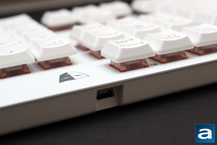 From this shot you can also see how much of the clear switch enclosure is exposed. This should hopefully allow for the LEDs in the Gram Spectrum to shine brighter and make for a nice effect when reflected off the backplate. Finally, from this angle, you can see the back plug, which is a mini USB connection. This is pretty standard for mechanical keyboards, as smaller connections such as micro USB are not as durable and can break easier. The cable accompanying the Tesoro Gram Spectrum is a white one, measuring 1.8m in length. Otherwise, there is no additional USB ports or audio connections, though I have never really found them useful before.