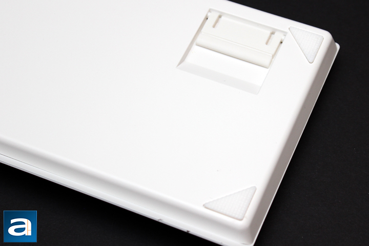 From underneath the Tesoro Gram Spectrum, you can see there are very few surprises overall. In the four corners we find isosceles right angle triangles of textured rubber grips holding the keyboard in place. Beside the top two corners are wide kick stands to help prop up the Gram Spectrum. Thankfully these feet are also rubber tipped. These traction pads, in addition to the weight of the keyboard, easily keep the Gram Spectrum from moving around.