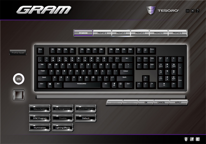 As for secondary functions, the Tesoro Gram Spectrum has its share. These can all be activated by pressing the Fn key prior to pressing the secondary function key. F1 to F5 are the shortcuts to jump between the five gaming profiles. These profiles are where macros can be saved and activated in. F6 is used to lock the Windows key. F7 to F9 are made for volume controls, including Mute, Volume Down, and Volume Up. Finally F10 to F12 are media controls, including Play/Pause, Previous Track, and Next Track. There are a few more function keys, including Insert and Delete, which are used for switching between 6 and N for key rollover. Home key resets the keyboard to initial settings, and Pause switches gaming mode on and off. The last set of keys are located on the arrow pad, and these are used for changing the lighting conditions. Up and Down are used to increase and decrease brightness, while Left and Right are used to switch between the multiple lighting modes. These modes will be covered in detail later on in the review.