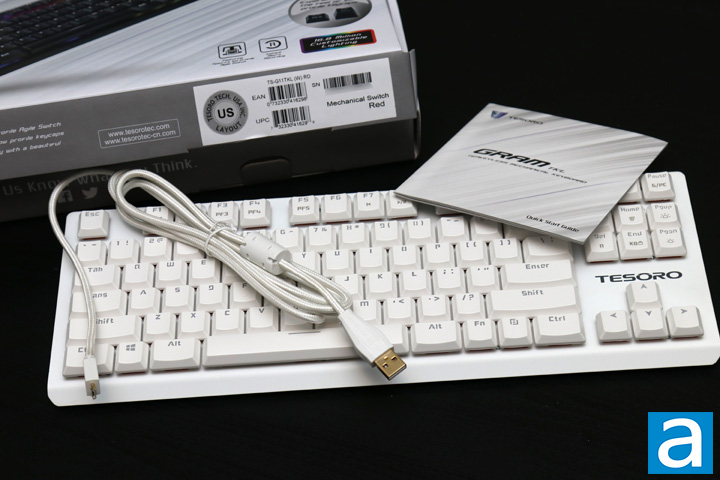 Out of the box, we have the Tesoro Gram Spectrum TKL in a plastic bag to prevent it from any surface damage during transport. It was held in between two foam brackets to further protect the keyboard. We also have a cable in the matching color with the keyboard. It is a micro USB to USB cable measuring 1.8m in length. Finally, there is a small user manual with warranty information. Warranty is limited to a single year with Tesoro for all of their products, which I think should be increased to a minimum of two years with most peripherals. It also would have been nice to see a carrying case since this keyboard is so slim and targeted for portability.