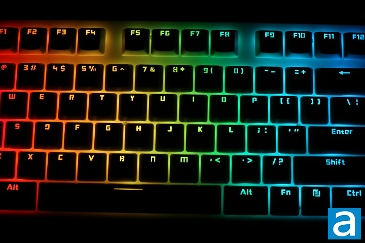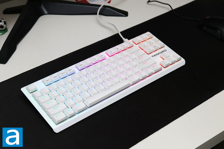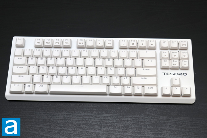 The best thing I liked about the original Gram Spectrum was how light bounced off the white backplate and dispersed out. As with the Tesoro Gram Spectrum TKL, the light does the exact same effect. In fact, you can actually see the lighting spill in our previous photo despite being in a fully lit room. You can see that all the secondary keys such as the special symbols on the numbers are printed beside the number so they get the same illumination treatment. However, as we mentioned previously, any secondary functions are printed on and thus will not be visible in darker situations. Combining the white exterior with double-shot translucent keys and a clear switch enclosure, the Tesoro Gram Spectrum TKL is a well-lit keyboard with some under glow action.
