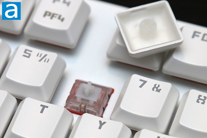 Our unit of the Tesoro Gram Spectrum TKL features Tesoro AGILE Red switches. This switch is intended to be like the Cherry MX Red switch, except with a lower profile and smaller traveling distance. The OEM for these switches are still Kailh. Linear switches are often favored by gamers, as they feature a quiet typing experience and a relatively low actuation force to trigger them. These are rated to last up to fifty million keystrokes, which is the same as most Cherry MX switches. With the shorter travel distance, we still have a 45g actuation force, but a travel distance of 3.5mm and actuation distance of 1.5mm, which shaves 0.5mm in both categories compared to regular Cherry switches. Otherwise, you can see there is a clear enclosure for each switch, allowing the RGB lighting to spill through and bleed out.