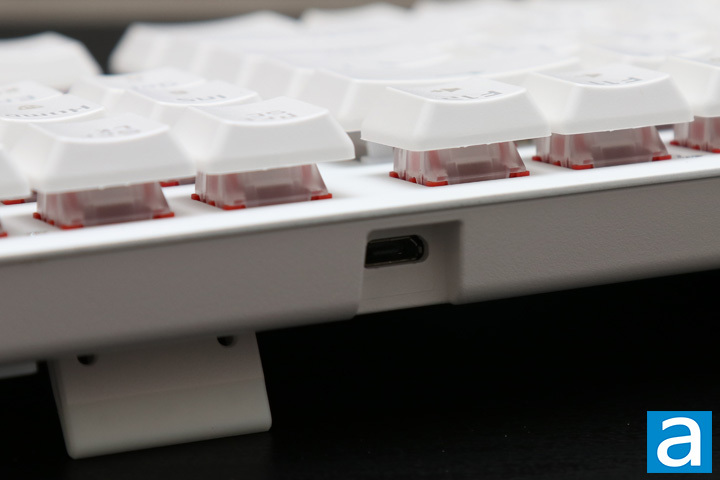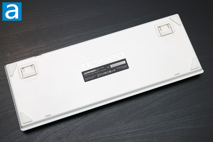 At the bottom of the Tesoro Gram Spectrum TKL, we have nothing too surprising. With a triangle in all corners, these rubber feet keep the Gram Spectrum TKL in place and away from moving. Two back feet kick out to raise the keyboard up. These feet are also capped off with rubber to prevent them from sliding about on harder services. There is also a large central sticker with model information and the serial number. An engraved Tesoro logo can also be found on the back. Otherwise, the whole white exterior is kept with this white metal back, which is great to see.