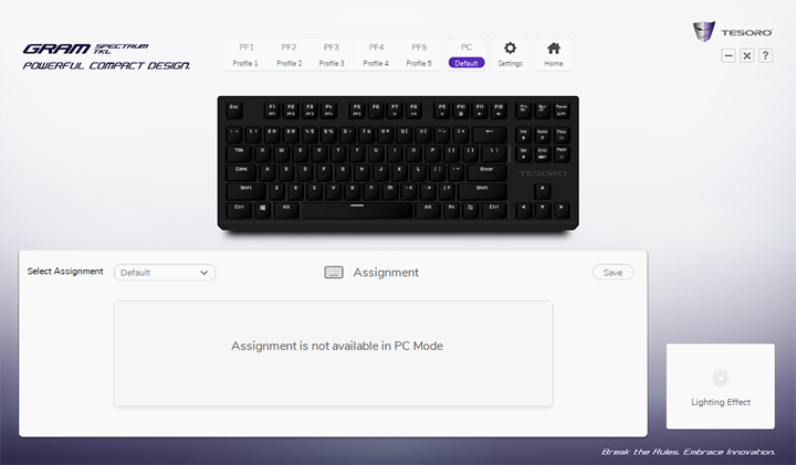 As for secondary functions, the Tesoro Gram Spectrum TKL keeps most of the ones we have seen before. These can all be activated by pressing the Fn key prior to pressing the secondary function key. F1 to F5 are shortcuts to jump between the five gaming profiles. These profiles are where macros and specific lighting profiles. It should be noted that any profile mode automatically also turns on gaming mode, which means the Windows key is disabled. F7 to F9 are made for media controls, including Previous Track, Play/Pause, and Next Track. Finally, F10 to F12 are volume controls, including Mute, Volume Down, and Volume Up. There are quite a few more function keys, including Insert and Delete, which are used for switching between 6 and N for key rollover. Home key lets you record macros on the fly, Pause switches gaming mode on and off, and End is used to lock the entire keyboard. The last set of keys are located on Page Up and Down, which are used to increase and decrease brightness, respectively. Tesoro says the Fn + Windows key should disable the Windows button, but it never worked with my keyboard. I have never seen a secondary function not work before out of the box and hopefully this can be fixed with a firmware update.