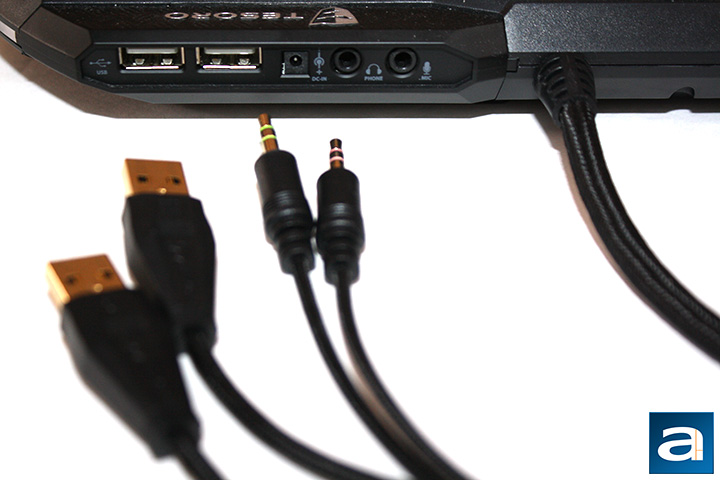 Looking at the backside of the Lobera Spectrum, you can see it features a number of connections. Starting from the left to the right, there are two USB 2.0 ports, external DC source, headphone jack, and a microphone jack. These connections make it easier to access ports commonly used by typist and gamer alike. Tesoro has attached a removable sticker covering the ports to notify users of the maximum current capacity of the USB port is 100mA, and should not be used as a charging power supply. However, these ports are useful when users need to plug in and access USB drives. Although Tesoro has not provided the Lobera Spectrum with the newer USB 3.0 interface, this is still a nice feature to have. The headphone and microphone 3.5mm inputs are an extension for the keyboard connecting to your computer. This is especially useful for myself due to the earphone jack on my PC being more than a headphone cable's length away from my chair. A feature I would like to mention is the braided cable located next to the ports. It is not uncommon, but it is always nice to see in terms of craftsmanship in their products. The cable measures 155cm from the keyboard to the end, which features two gold-plated USB connectors, and gold-plated audio and microphone jacks. As I have mentioned in my Genius GX Gaming Maurus X review, gold-plated USB connectors are nice to have, and it is pretty to look at, but it does not really do anything practically or electrically (It does, to some extent, for the analog 3.5mm jacks though). The four individual cables split off from one another about 30cm from the actual connectors.