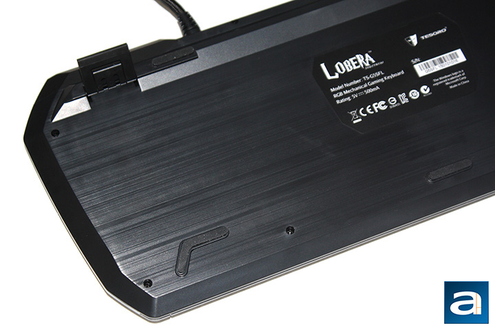 Flipping the keyboard over for the last physical inspection, the Lobera Spectrum met the standards I had envisioned in a keyboard of this caliber. Looking at the base of the keyboard, there were seven main points of contact, and all were rubberized to prevent any movement during usage. In addition, with its 1.5kg weight, the keyboard certainly did not move accidentally. I was especially pleased with the angular rubberized feet at the bottom two corners of the base. For myself, I feel as I am using the keyboard, it tends to move toward me, and the angular rubberized feet really provide an extra stickiness, so it stays in place even during your most hardcore gaming sessions. In addition, not only has Tesoro made the back legs of the keyboard larger than previous models, they have also made the bottoms of the legs rubberized. Whether or not users choose to pop the back legs, the keyboard will still stick to the surface of your desk. I did pop the back legs to give the keyboard a little boost, and to get the height I preferred.