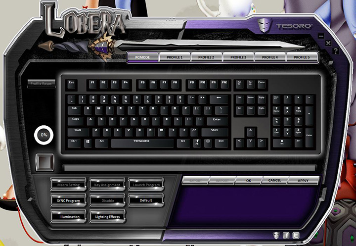 Included with the Lobera Spectrum is an application to set up all your macros. Like the many of the Tesoro products, this utility does not work across the board with all of the company’s products. A unified software suite would have been a lot more convenient, especially for users who own more than one product from the company. The Lobera Spectrum is able to store up to 300 macros, meaning every key on the keyboard is programmable, and can be stored in its onboard memory. Inside the keyboard is 512KB of onboard memory, which is used to store all your macros. But since there are five different profile modes, there is no way to tell which profile is active, unless you have different LED lighting effects for each, and you can accurately remember the effects corresponding to the profile.