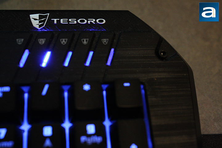 Taking a closer look at the Lobera Spectrum keyboard, you will find it is simple in design. However, this is true only at first glance, and false when you look at the keyboard as a whole. It has everything a keyboard is expected to have, and gives users more. The majority of the keyboard surface surrounding the keys are matte black in color, and does not leave fingerprints behind. Tesoro has gone with a smoother brush-like metal finish on the overall surface, in contrast to the texture of the wrist rest and the top right corner of the keyboard. Much like the Tesoro Durandal Ultimate reviewed by Aaron, the wrist rest and the top right corner both has a diamond plate floor pattern, making it look more rugged and industrial. The Tesoro logo appears only once on this keyboard; at the very top right corner. Along the bottom of the logo are LED light features for the Num Lock and Caps Lock. Echoing what Aaron has previously said about manufacturers labeling their products, “I quite like it when manufacturers do not label up their products very much, or at least make the labels more discreet, as in-your-face logos make products look cheap.”