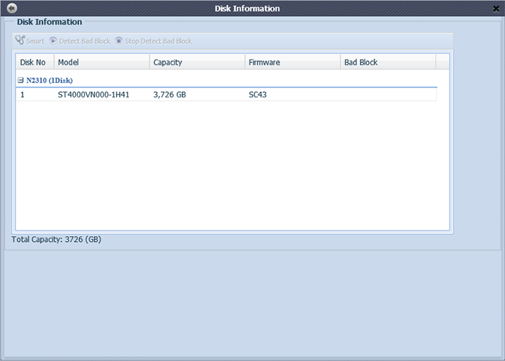 The next section I would like to talk about is the Storage section. The first menu we will look at is the Disk Information, which displays all the information about the attached disks. This includes the name of the disk, the total capacity (As opposed to the free or available space) and the firmware. Included in all this is also the ability to check for S.M.A.R.T. status, just by clicking the “Smart” button at the top. This gives information about disk temperature, as well as checking for S.M.A.R.T. status using short and long tests. On its side is an option to scan the disk for bad blocks of data. If a bad block is found, it will be displayed in the Disk Information menu. Interestingly, there is no option to allow for disk standby after a certain amount of time, unlike the Thecus N2560.