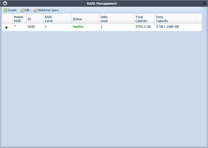 The next thing we will look at is under the RAID Management section. This displays all the drives once again, as well as the status. Just for your information, the column “Disks Used” displays which slots the disk is in, and not how many drives are in the Thecus N2310 at the time. The main point of this menu is to set up a RAID configuration, which can be easily set up through the “Create” button. This launches a wizard to set up RAID in the following fashion: JBOD (Linear Disk Volume), RAID 0 (Disk Striping), and RAID 1 (Disk Mirroring). Of course, because we only have one drive in there, this is placed in single disk configuration.