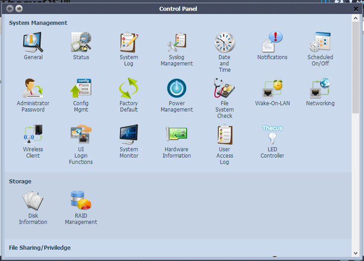 The Control Panel can be accessed by pressing on the small rectangle and cogwheel on the front page in the top left hand corner. As aforementioned, this is where all the different functionalities are located, and we will be looking at the more important parts of each one. Starting at the System Management section, most of these icons tell you information about your NAS, with some being more important than others. As well, many of these icons link to windows with only one single setting switch, or even a single sentence for status. I would rather Thecus combine these into a single icon with tabs, if needed. This would allow for a cleaner Control Panel. On the other hand, this is a personal preference, and the job still gets done, but it is a bit cluttered. I will quickly go through some of these icons and what they are used for. Status identifies the status of various services; most of them being file sharing and networking. The System Log gives us a detailed record of everything happening with your NAS including reboots, log ins, and the like. Scheduled On/Off manages automatic on and off, and can change for different days of the week and times. Other options under this tab allow for resetting to default conditions, Wake-On-LAN, enabling/disabling the Thecus logo LEDs, and downloading/uploading setting configurations. The Wake-On-LAN is a handy feature as it allows the NAS to automatically turn on once a network message is received.