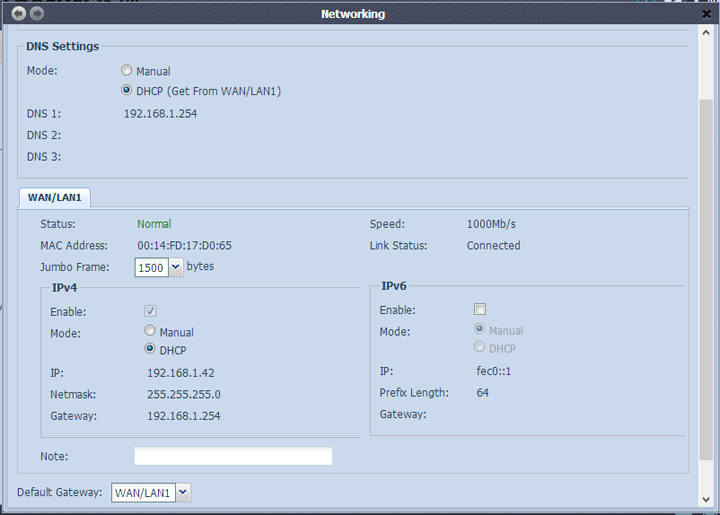 Networking allows users to change the connectivity settings. At the top (Not shown in the image above), you can change your host name, domain name, as well as adding WINS Servers. Underneath, you can allow for manual or automatic DNS for identifying your NAS. Under the WAN/LAN1 tab, you can enable and disable IPv6, as well as change to jumbo frames. You can also see the status of your connections. Under IPv4, you can manually set the IP addresses if you so wish to, or allow for automatic settings. In the wireless client section, you can set up connections via Wi-Fi using an installed wireless dongle. While majority of users will not be implementing their NAS over Wi-Fi, especially since a wired network is usually much faster and less prone to loss in quality, it is good to see this option being available.