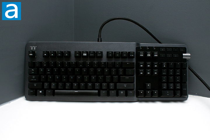 The Thermaltake ARGENT K5 RGB measures in at 465 mm length, 161 mm width, and 46 mm height. Compared to other keyboards, this is slightly bigger than average. In terms of mass, this weighs in at 1465g, which is a little heavier, but this is expected with the greater size. Going into build quality, the top deck does show a small amount of flex when pushing into the keyboard, but it is not noticeable in any actual use case, as this did not occur until I applied a significant amount of force. As this uses an aluminum top plate, this keyboard is quite sturdy. I proceeded to try to twist the keyboard, finding little to no give. The build quality is more than satisfactory for general use and performance, so there is nothing to worry about unless you have a mild case of gamer rage and decide to smash the ARGENT K5 RGB against a wall.