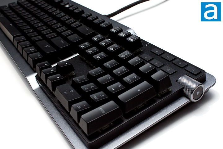 The Thermaltake ARGENT K5 RGB comes with the standard 104-key QWERTY ANSI layout with the added benefit of dedicated media keys, gaming profiles, light brightness, Windows lock, and a scroll wheel. The QWERTY ANSI layout is the standard American layout, which uses the single row Enter key, as seen in the image above. The keyboard has a standard bottom row, meaning that all keys on the bottom row are the same size, excluding the space bar. Moving to the top right side of the keyboard, we have our previously stated keys and a volume scroll wheel, but on the left, we find the three LED indicators for Number Lock, Caps Lock, and Scroll Lock, from left to right. The media keys are nothing special, being regular buttons on the keyboard. The scroll wheel is very smooth, but each tick seems to change the volume by 4 rather than the regular 2. Thermaltake can do some tinkering here to adjust the precision of the scroll wheel, but the scroll wheel itself works very well. The placement of the mute/unmute button is on the side of the scroll wheel. This position is good as it does not allow for accidental presses while requiring an adequate amount of pressure to actuate.