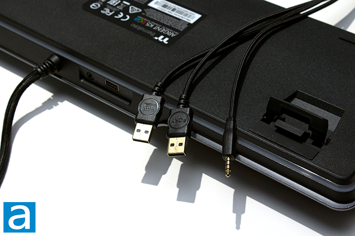 At the back of the Thermaltake ARGENT K5 RGB is a cable that splits into two USB cables and a 3.5mm audio jack. It comes out from the center and is fixed. My one complaint about the placement of the cables is how there are no runways underneath the ARGENT K5 RGB. I personally like these tunnels as they help reduce clutter on my desk. I appreciate Thermaltake for using braided cables, which offer durability and feel better compared to rubber cables. As previously mentioned, this cable splits into two USB connectors and a 3.5mm audio jack. The extra USB and audio plugs are passthrough for the USB port and audio jack port at the back of the ARGENT K5 RGB. This is a nice addition to have, as it gives the user more options and gives them easier to access ports.