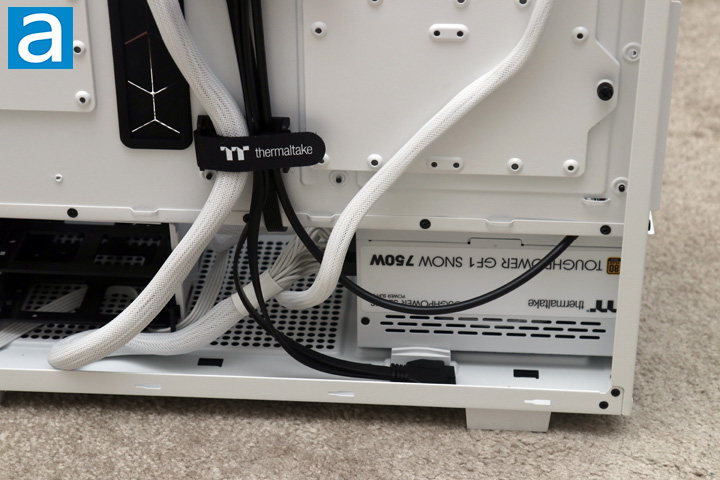 As usual, building with the Thermaltake Ceres 500 TG ARGB Snow started with my power supply. This involves plugging in the necessary cables and mounting the power supply into the mid-tower. The power supply in question is the Thermaltake Toughpower GF1 Snow 750W, which is 16cm in length. Thermaltake recommends a maximum 22cm length for supported power supplies, but you could get away with even longer ones if you remove the drive cage. During the routing process, I appreciated the plastic holder at the top for the CPU cable. There was also a metal lip at the back to keep the CPU cable in place. Otherwise, I routed the PCIe power cables through the hole above the drive cage. I also directed the front I/O and fan cables to the right spot at this point.