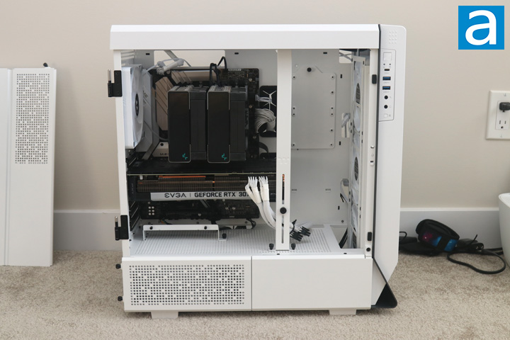 Afterwards, I plugged all my peripherals into the back and turned on the system. All of the fans spun to life and my system illuminated white from the fans. I really liked the lighting, as the fans added a nice glow to the rest of the machine. The other thing I noticed when powering the system on was the high airflow nature of this case, especially when it came to the noise. According to our standard APH Networks sound scale ranges from 0 to 10, where 0 is silence and 10 is loud, I would rate the Thermaltake Ceres 500 TG ARGB Snow around a 6.0/10. Under more regular loads, the noise was closer to a 4.0/10, as it was still audible. Unfortunately, the many included fans made a notable hum, especially when the system was under full load. The case also does not block or reduce this noise through any dampening foam or other means, so users should be aware of this.