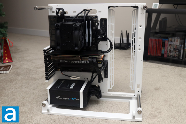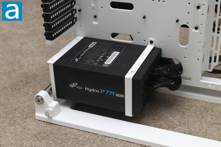 Installation into the Thermaltake Core P3 TG Pro Snow is a pretty easy process, especially as there are very few walls or barriers to contend with. Starting as usual, I installed the power supply, which is the FSP Hydro PTM Pro 1200W. This is a pretty lengthy power supply at 19.0cm. Thermaltake says you can install a unit up to 200mm, as anything longer will block the cabling hole. You can see even at 19.0cm, the hole is half-blocked. It would have been nice to see this increased in size, but I think this is only problematic if you have a PSU as large as mine. You will need to install the bracket at the back onto the power supply first, then screw in the whole unit to the back of the Core P3 TG Pro. Next, you can use a C-shape bracket near the modular cables as an additional support brace. This mounts into two holes, with one above the PSU and one at the back of the frame. I also routed all my power cables in this step to make the next installation steps a bit easier.