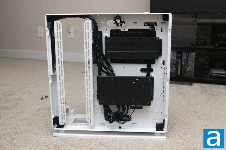 On the back, you can see that cabling space is not an issue on the Thermaltake Core P3 TG Pro Snow. There is a lot of space behind the VESA mounting hardware to hide cables. As I only have an M.2 SSD in this system, we do not have to use any of the drive cages, but I would have no concern for physical space if I did need to fill up this area. There were also many tiedown points around the edges and at the back of the motherboard to help with managing the extra cables.