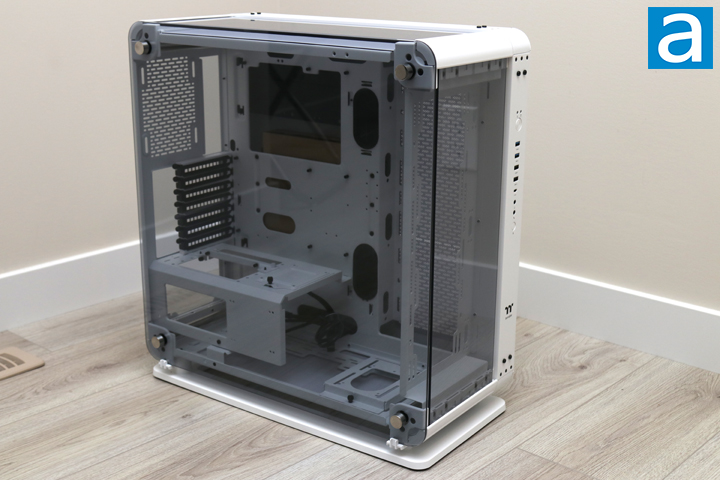 The Thermaltake Core P6 TG is an eye-catching mid-tower case, especially with its three panels of glass exposed on the side, front, and top. However, the glass is not the only thing that makes this case stand out. We have a typical rectangular prism, as you might expect, except with curved corners to make for a more rounded look. Thermaltake has clearly taken their larger Core P8 and shrunken it down to this mid-tower form factor, but I still appreciate what they have done here. As for the Snow part of the name, this is an almost fully white case with only some minor parts like screws and things being black. It is quite clear this enclosure is meant to show off everything inside rather than being a showpiece itself. With how exposed everything inside is, the Core P6 TG Snow seems more like a frame than a full enclosure. Unsurprisingly, you can remove a lot of these panels to make it more of an open-style case, but we will explore this as we continue on. From this angle, you can see all of the tempered glass panels, including the left-side, front, and top panels. The front and top have notable spaces measuring around 1cm on each side of the glass to allow some airflow here.