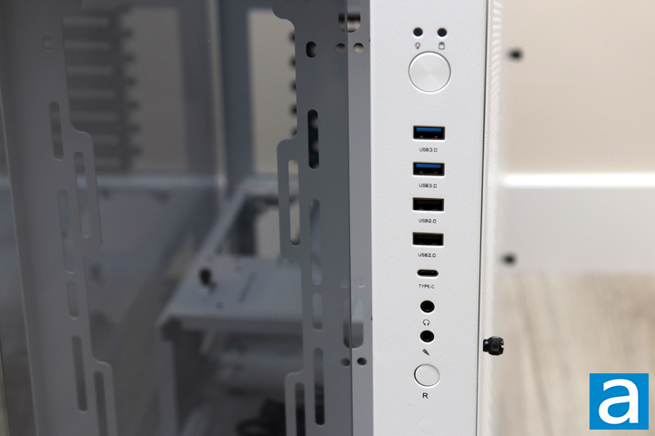 Down the front, we have the standard set of I/O connections. From top to bottom, we have two small circular LED lights. The left one is a blue power indicator, while the right is a red flashing drive activity light. A large circular button underneath is the power button. Moving on, we have two USB 3.2 Type-A ports, two USB 2.0 ports, USB 3.2 Type-C plug, and two 3.5mm audio jacks for headphone and microphone. Finally, we have a smaller circular button, marked with an "R" for reset at the very bottom. It is pretty nice to see all these ports available on the front, although some may see the older USB 2.0 as a bit outdated. Even so, I think the internal header often ends up unused, so I can appreciate having an extra set of ports present, even if they are slower. Otherwise, you can see the intentional gap between the front panel glass and the side for airflow.