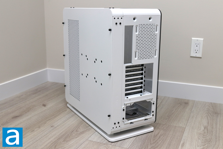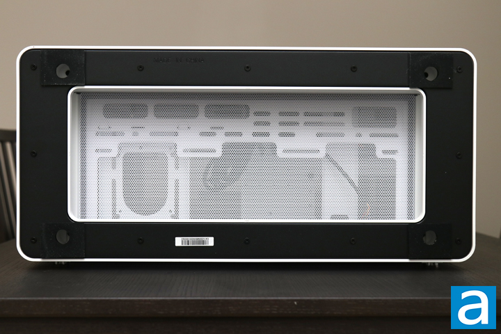 At the backside of the Thermaltake Core P6 TG Snow, you can see there are a few interesting points on both panels. As for the back, you can see we have a generally typical layout with openings for the motherboard I/O beside a grille and rails for a single 120mm exhaust fan. It would have been nice to see mounting rails for 140mm options too. Underneath, we have an insert with seven expansion slots beside another large opening at the back. At the bottom, we have one more opening for the power supply. The opening is surrounded by a removable frame to mount to your power supply, so that the whole unit can be slotted in from the back. As for the right side panel, you can see there is a grille opening closer to the front for air to pass through. This lines up with rails inside the case, as we will see later. Near the back, we have a large number of holes in a bit of an X-pattern. This lines up with standard VESA mounting positions, including holes that match the VESA 75x75, 100x100, and 200x100. This allows the Core P6 TG to be mounted to your wall if you so desire.