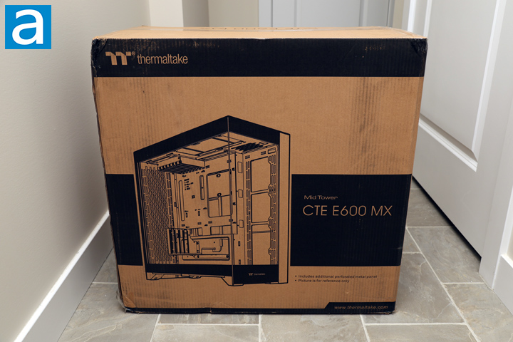 Our review unit of the Thermaltake CTE E600 MX arrived from their American offices in City of Industry, California, USA. Traveling with UPS and their Standard ground service, this box arrived in relatively good condition. There are some bruises on the corner of the box, but no holes or significant dents to be worried about. This was brought to our APH Networks location here in Calgary, Alberta. Otherwise, you can see this box also doubles as the retail container of the enclosure. This means we have a printed box in black and white with a scaled down image of the case inside. The company name and logo can be found on the top edge, while the product name can be found beside the scaled image. Around the box, we have some specifications and features about the case.