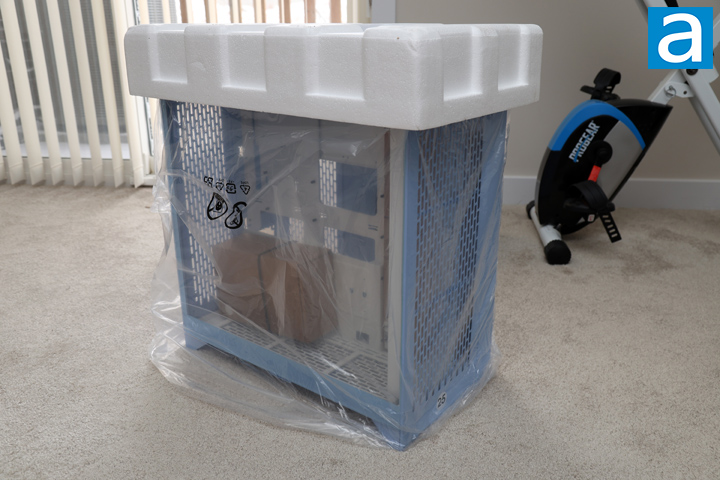 Out of the box, the Thermaltake CTE E600 MX is sandwiched between two stiff white foam brackets. They are not the more premium option for foam, but they will do the job of transporting the case on its own. The case is also in a clear white plastic bag to prevent surface damage such as light scratches or debris. As well, all of the glass panels have a plastic wrap on them to further prevent this sort of damage. In addition to those, there is one cardboard box secured inside the CTE E600 MX, as well as one large box outside and placed on the side of the case. This larger one holds a single front tempered glass panel, as you will see later on.