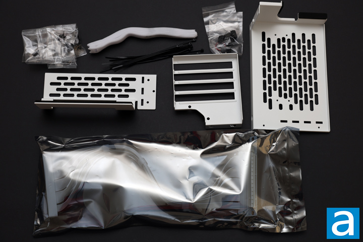 The interior box holds a few nice accessories. First, we have the mounting screws and other accessories to aid in installation, including some white Velcro straps and black zip ties. Next, we have a set of white mounting frames for various video card installation orientations, which we will explore during the installation process. Finally, we have a PCIe 4.0 riser cable to work with the mounting frames. This is a premium addition that is not the norm for cases that offer vertical graphics card installation.
