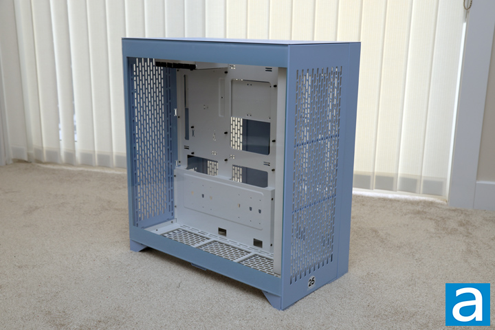 In its default configuration, we have a mesh front panel with lines of slits to allow for air to flow through. Behind this is a mesh filter to prevent dust and other debris from flowing through. This full blue panel is finished off with a Thermaltake logo at the bottom with a large '25'. As I have mentioned in the SWAFAN EX14 ARGB Sync review, Thermaltake is celebrating their 25th year of operation. This steel front does not extend all the way on the front, as part of this area is made up of the backside steel. Around the side, we have a tempered glass panel for clear sight lines into your system.