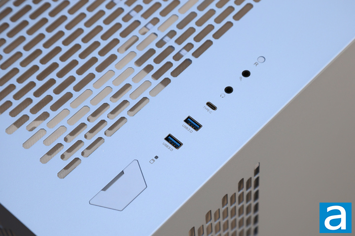 All of the user accessible I/O on the Thermaltake CTE E600 MX can be found on the top of the case. This column of jacks and buttons starts with a large trapezoid power button. There is a clear slit on the side that lights up white when your system is powered on. Next, we have a drive activity light that flashes during primary drive activity. Above, we have two USB 3.1 Type-A ports and one USB 3.2 Gen 2 Type-C port. Moving further, we have 3.5mm audio jacks for headphones and microphone. Finally, we have a small, slightly recessed circle reset button. Moving away from the I/O, you can see the top ventilation area, again with rows of offset slits and a mesh filter underneath.