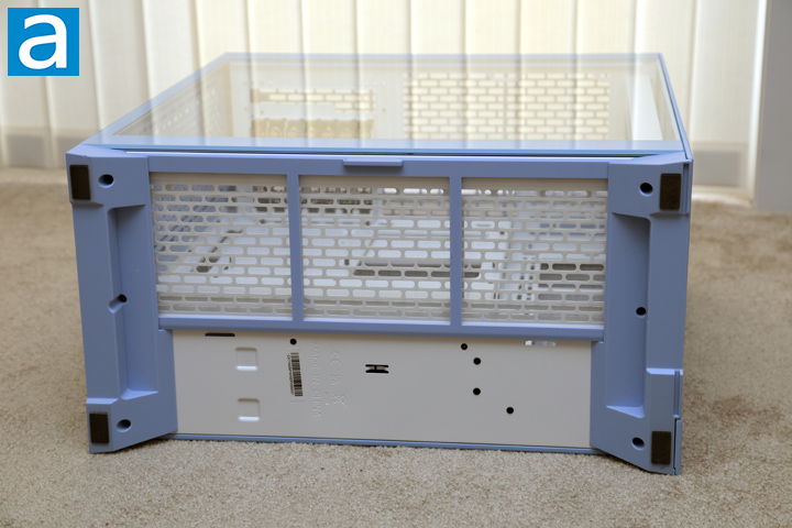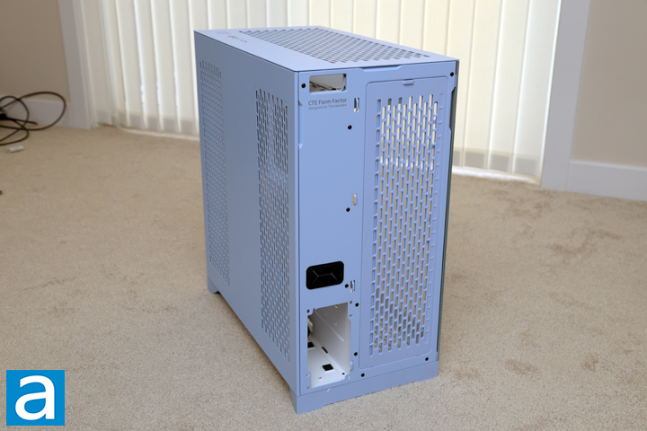 Taking a look at the flip side, you will see a solid steel panel with a pair of ventilation areas. This ensures air can flow in and out of the case when you mount fans or radiators here. At the back, despite having a full column of slits, the only component that requires ventilation is the power supply. The power supply is mounted at the bottom side with a large opening for ATX-sized PSUs. Above this, we have a pass-through hole with a rubber grommet around it. At the very top, we have another rectangular hole. These are used to get access to your motherboard back I/O for your peripherals, but we will explore these later in our internal inspection. Down the middle, there are several cable hook points where you can organize the cables leading out. Finally, we have a large plastic panel that holds yet another mesh filter for the back ventilation area. With all the perforations visible from the outside, it is evident that this case prioritizes unrestricted airflow for users.