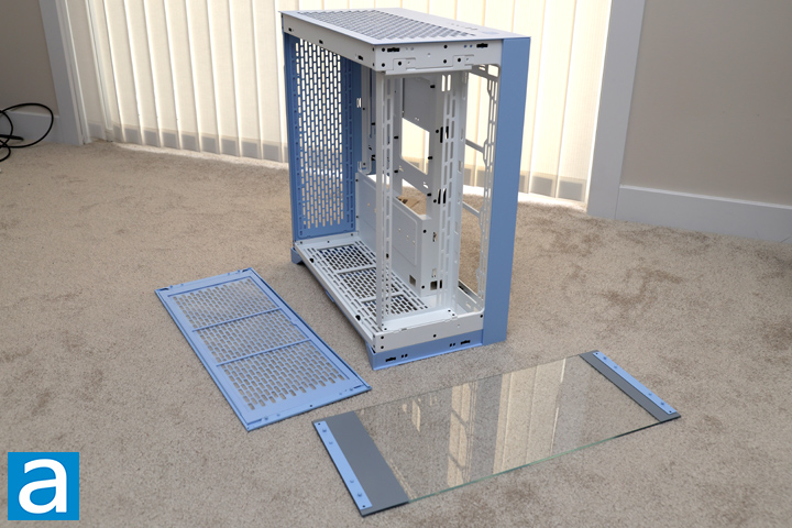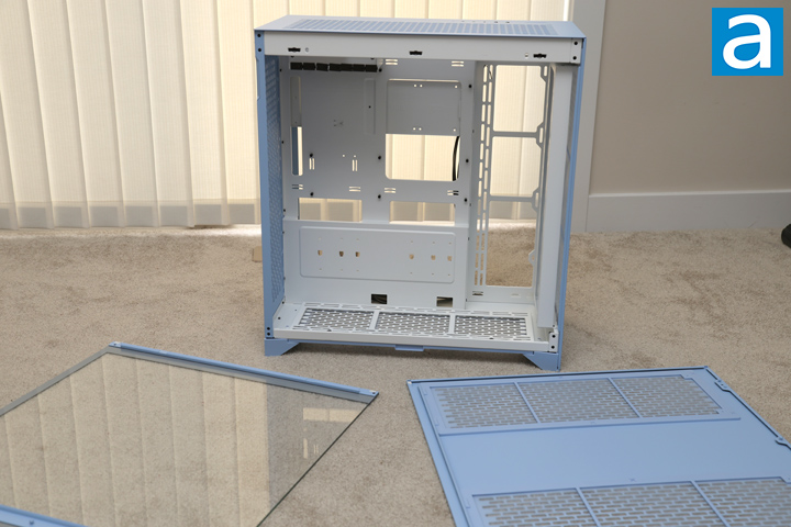 Getting inside the Thermaltake CTE E600 MX is a tool-less affair, as both side panels are held on with ball-and-socket joints. The tempered glass panel has steel frames on the top and bottom with protruding ball joints. A small lip at the back also helps with getting an easier grip on the panel. Moreover, once the panel is removed from the joints, it remains balanced until you open it further. This 4mm thick pane is not tinted, so you will have clear visibility to the interior. Unfortunately, there is zero padding between the side panel and the rest of the CTE E600 MX, which would prevent the two hard materials from bumping against each other. I found a slight chip in the glass on the outer edge, but this likely happened during transportation. The top and bottom edges are filled in with the same blue color, so you can hold the panel in this area without leaving noticeable fingerprints on the inside. The flip side steel panel is removed in a similar fashion with its ball-and-socket joints.
