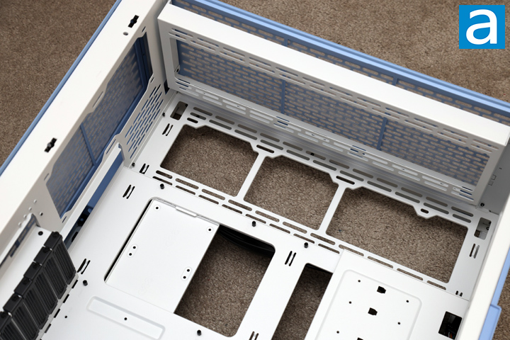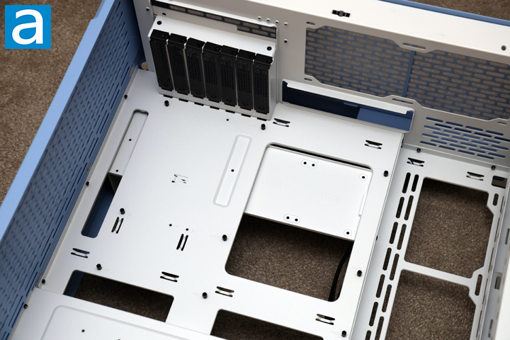 At the back of the case, you can see even more slits. Once again, you can mount even more cooling at the back. At the bottom of the case, we have the fifth and final position to place fans. This sits on a slightly raised frame to provide a gap for airflow with less impedance. There are six pairs of screw holes with an interestingly shaped opening in between each pair. These are used to mount the hardware for holding a vertically mounted graphics card in a floating-like manner, as you will see later in this review. The motherboard area is also sunken down compared to the bottom area, and there are two large holes to route cables from the back of the Thermaltake CTE E600 MX to the motherboard. Another long and thin hole sits at the back for this same purpose. All of these holes are rounded to prevent cables or fingers from being cut on sharp edges, but there are no rubber grommets here to hide cables.