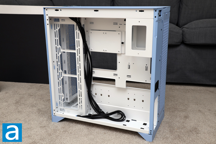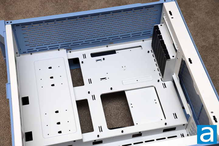 At the bottom, we have a large area for the power supply. This configuration requires the PSU to be positioned horizontally, expelling air out the back side of the case instead of the bottom. Furthermore, foam pads at the bottom prevent vibrations between the power supply and the rest of the case, which enhances overall stability. With a minimum gap of 7.0cm and even more space available at the bottom, the ample room for cable management makes working in this area quite convenient.