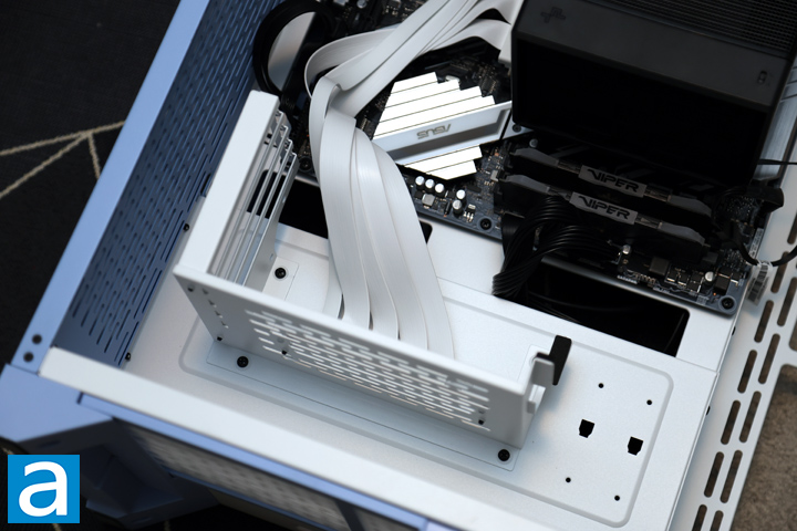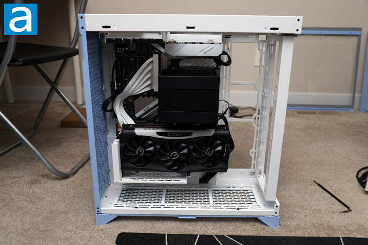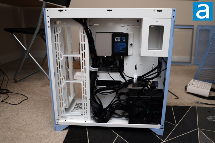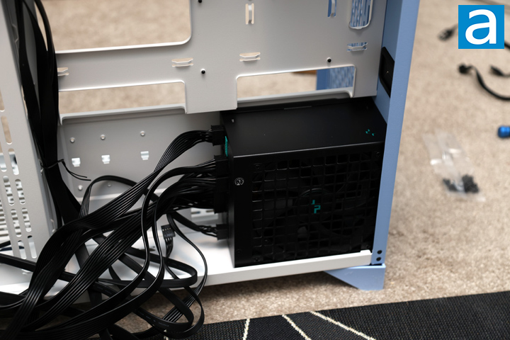 As with all of my installations, I started by installing my power supply in place. The DeepCool PX1000G 1000W measures 16cm and it fits well within the area. Thermaltake specifies a maximum length of 220mm for power supplies. Even with power supplies up to the maximum specified length, there is ample room for cable management, although some routing holes may be covered. I routed the PCIe power cables through the bottom edge, while using the side valley for the motherboard power cable. I also directed the front I/O and fan cables to the bottom edge at this point. White cables would complement the lighter-colored case, but this is a minor consideration.