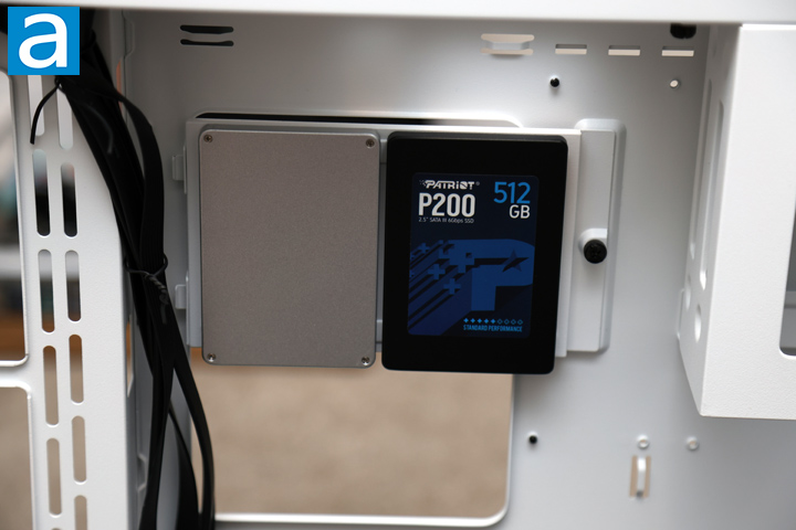 Behind the motherboard opening, I mounted my two SSDs in place. The Patriot P200 512GB and OCZ ARC 100 240GB mounted to the sled here with screws. There is ample clearance here, so even if you need to use straight SATA cables on the drives, they will not experience too much of a bend at the connector