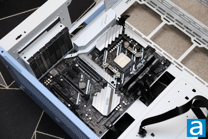 On the flip side, I installed my motherboard in place. With the pre-installed risers in place for a standard ATX motherboard, installation was quick. It is worth nothing that if you have a separate motherboard I/O plate, you should not install it in this case. As you can see, there is a large gap between where the motherboard sits and the opening. This makes any separate I/O shield useless. My motherboard in question was the ASUS Prime X470-Pro paired with an AMD Ryzen 7 3700X. I also installed a set of Patriot Viper RGB DDR4-3600 2x16GB. With how far the motherboard is from the top of the case, you should have no worries about interference with the motherboard and any of the cooling mounting areas.