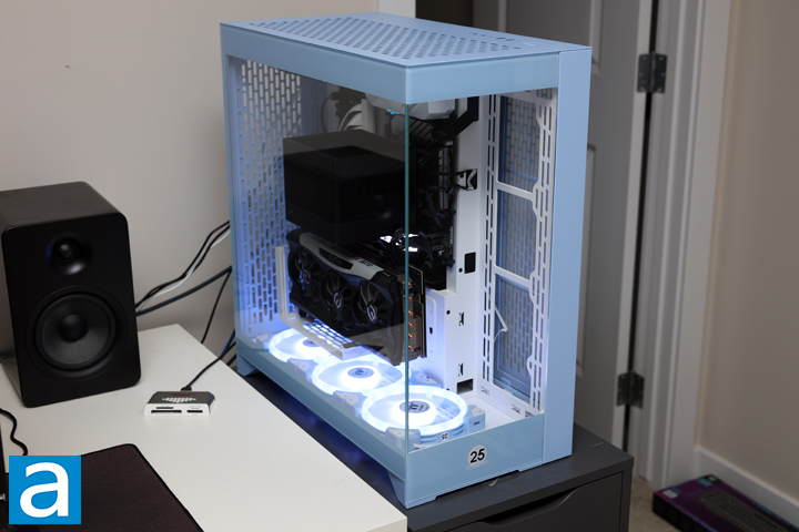With everything plugged in, I powered my system on, and everything spun to life. As you may recall, the Thermaltake CTE E600 MX does not come with any included fans. Using our standard APH Networks sound scale, where 0 represents silence and 10 indicates loudness, I would rate the Thermaltake CTE E600 MX at a 0/10, simply because there are no included fans. As you see above, I ended up throwing my own set of Thermaltake SWAFAN EX14 ARGB Sync cooling fans. Not only did these match the rest of the color scheme, but they provided some much-needed air intake. However, it is important to note this enclosure does not suppress noise well, even with the solid panels installed.